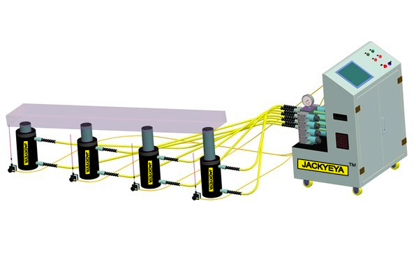 PLC多點(diǎn)同步頂升液壓系統(tǒng)分為5個(gè)部分:液壓泵站、PLC計(jì)算機(jī)控制系統(tǒng)、液壓系統(tǒng)、位移壓力檢測與人機(jī)界面操作系統(tǒng)。該系統(tǒng)是將液壓頂升系統(tǒng)、計(jì)算機(jī)PLC信號處理、位移監(jiān)控與橋梁結(jié)構(gòu)分析和施工技術(shù)進(jìn)行集成,并在集成系統(tǒng)上進(jìn)行的成套技術(shù)開發(fā)。其核心是在橋梁結(jié)構(gòu)分析與施工技術(shù)總結(jié)的基礎(chǔ)上,根據(jù)橋梁特性設(shè)計(jì)計(jì)算機(jī)PLC信號處理與液壓系統(tǒng),輸入外部監(jiān)控設(shè)施的位移信號,輸出液壓系統(tǒng)油量控制信號,利用終端多組千斤頂來達(dá)到平衡、安全與高效的橋梁頂升的目的,其頂升和降落精度誤差不超過±0.5mm,頂升載荷包括:50噸-1000噸,頂升高度為10mm到500mm。